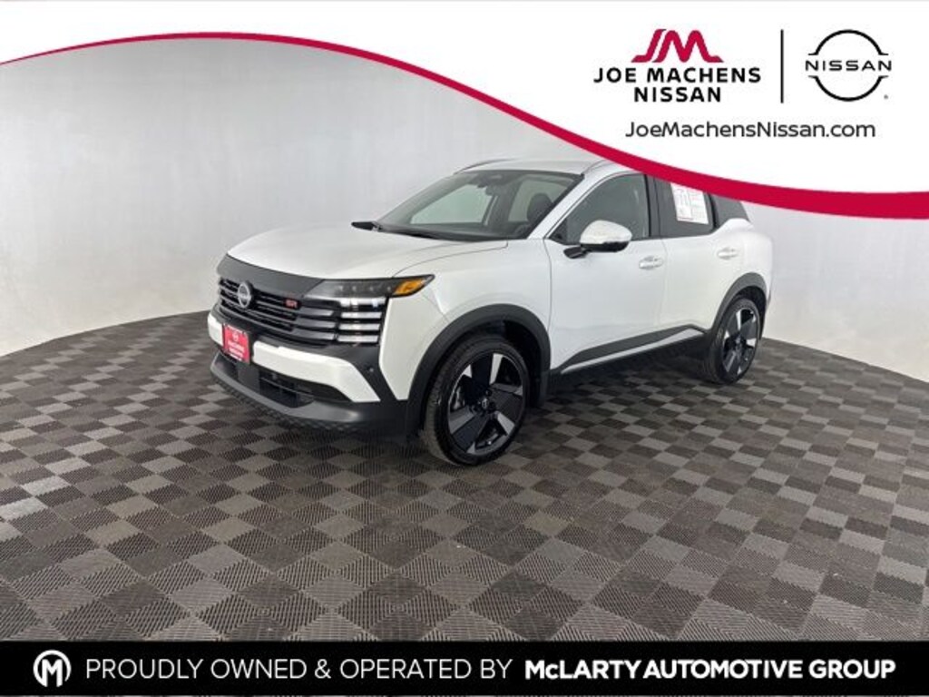 Finished in Aspen White Tricoat, the Kicks SR features bold styling with a sport-inspired design, LED headlights with automatic high beams, front fog lamps, and a rear spoiler. It rides on 19-inch alloy wheels with all-season tires. Additional highlights include heated power side mirrors with turn signals, deep tinted glass, rear wiper with defroster, and body-colored accents with black cladding.