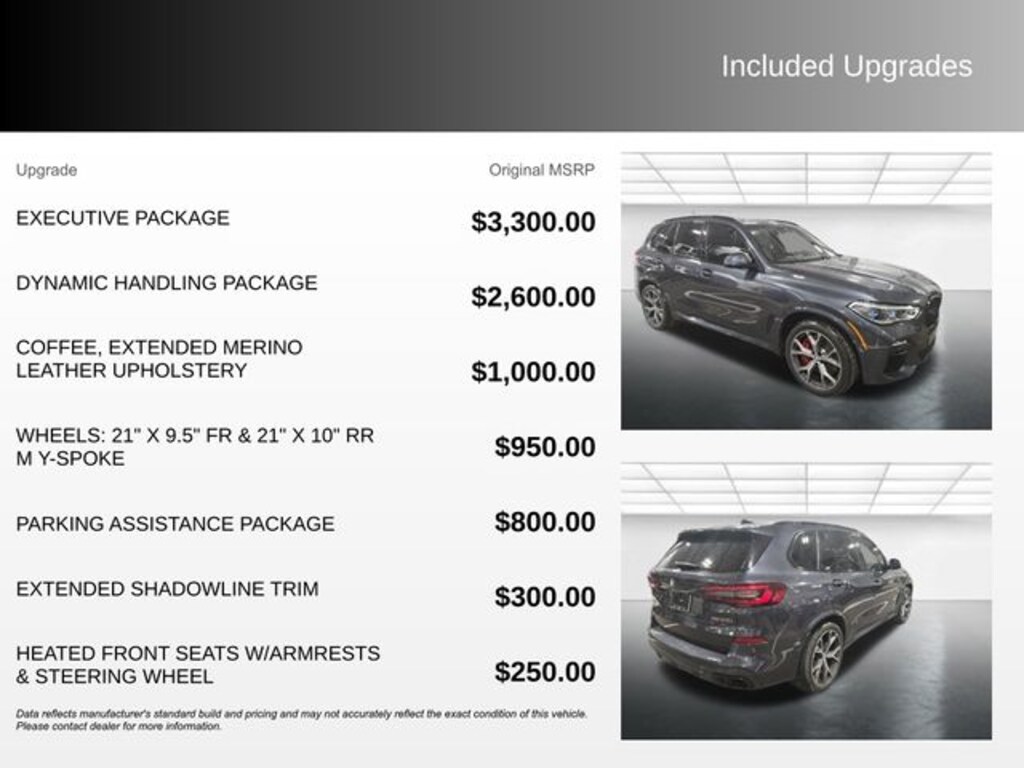 X5 M50i, 4.4L V8 DOHC 32V Twin Turbocharged, Coffee Leather, Active Park Distance Control, Active Roll Stabilization, Adaptive M Suspension Professional, Connected Package Pro, Drive Recorder, Dynamic Handling Package, Executive Package, Gesture Control, Glass Controls, Head-Up Display, Icon Adaptive LED Headlights w/Laserlight, Integral Active Steering, Panoramic Sky Lounge LED Roof, Parking Assistance Package, Parking Assistant Plus, Rear Manual Side Window Shades, Rear-View Camera, Surround View w/3D View.