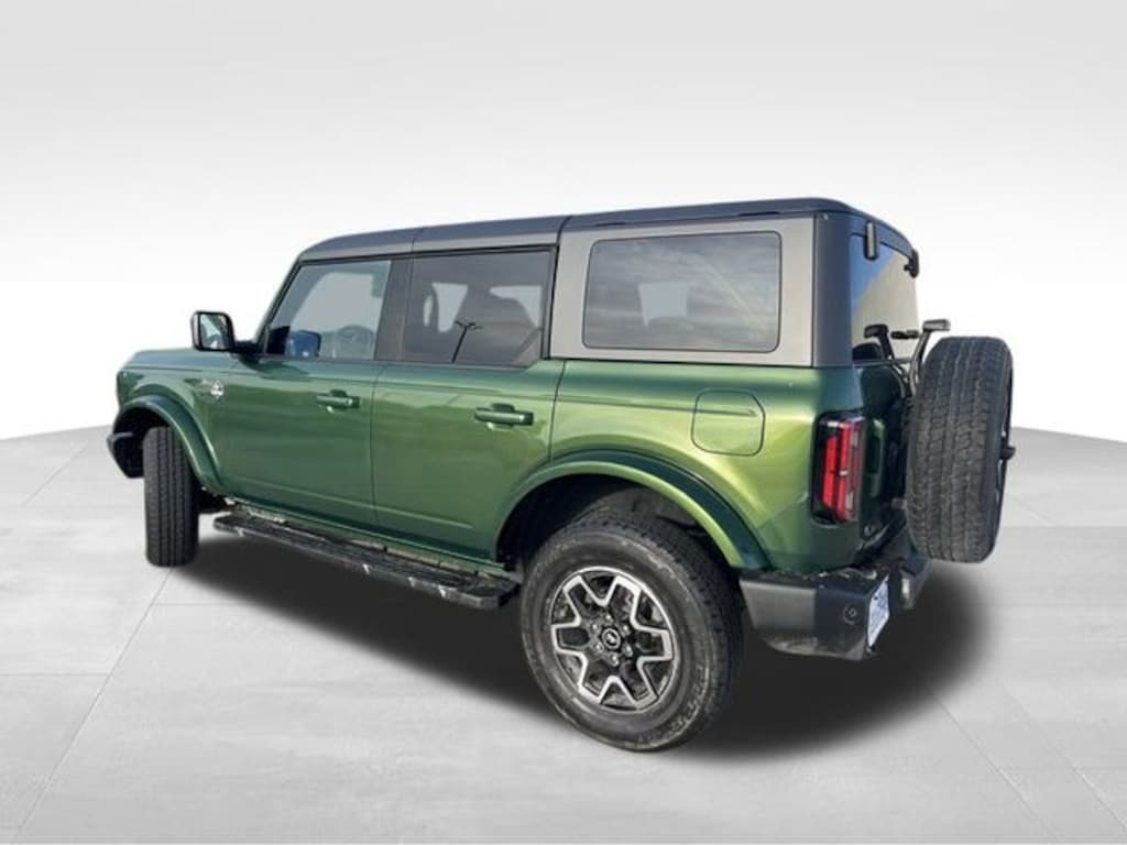 2023 Ford Bronco Outer Banks Eruption Green Metallic 4-Wheel Disc Brakes, 7 Speakers, ABS brakes, Air Conditioning, AM/FM radio: SiriusXM with 360L, AM/FM Stereo, Auto High-beam Headlights, Brake assist, Carbonized Gray Molded-In-Color Hard Top, Compass, Delay-off headlights, Driver door bin, Driver vanity mirror, Dual front impact airbags, Dual front side impact airbags, Electronic Stability Control, Emergency communication system: 911 Assist, Exterior Parking Camera Rear, Front anti-roll bar, Front Bucket Seats, Front Center Armrest, Front reading lights, Front Row Top Panels Storage Bag, Front wheel independent suspension, Fully automatic headlights, Hard Top Sound Deadening Headliner, Heated door mirrors, Illuminated entry, Integrated roll-over protection, Low tire pressure warning, Occupant sensing airbag, Outside temperature display, Overhead airbag, Overhead console, Panic alarm, Passenger door bin, Passenger vanity mirror, Power door mirrors, Power steering, Power windows, Radio data system, Radio: 6 Speakers w/Subwoofer Delete, Rear-Window Defroster & Washer, Remote keyless entry, Security system, SiriusXM Radio w/360L, Speed control, Split folding rear seat, Steering wheel mounted audio controls, SYNC 4, Tachometer, Telescoping steering wheel, Tilt steering wheel, Traction control, Trip computer, Universal Garage Door Opener, Variably intermittent wipers.