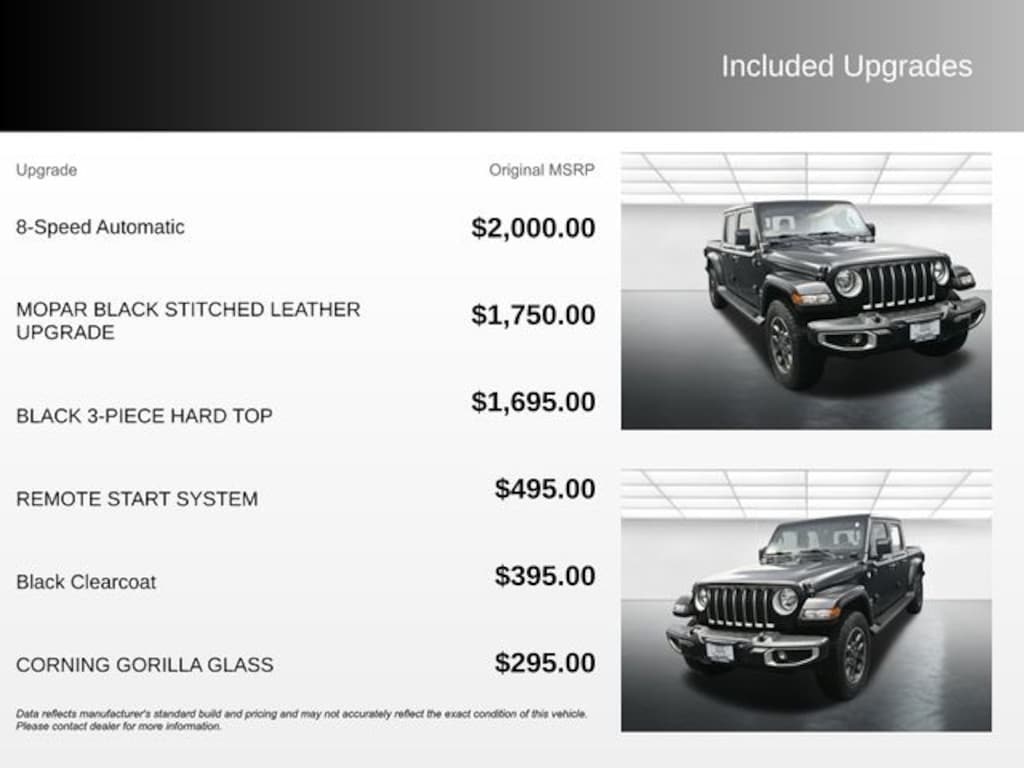 Gladiator Overland, 3.6L V6 24V VVT, 4WD, Black Clearcoat, 4-Wheel Disc Brakes, Air Conditioning, Apple CarPlay/Android Auto, Auto-dimming Rear-View mirror, Automatic temperature control, Black 3-Piece Hard Top, Compass, Delay-off headlights, Driver door bin, Freedom Panel Storage Bag, Front dual zone A/C, Front License Plate Bracket, Front reading lights, Fully automatic headlights, Garage door transmitter, Heated door mirrors, Leather steering wheel, MOPAR Black Stitched Leather Upgrade, Navigation System, Passenger vanity mirror, Power door mirrors, Power steering, Power windows, Quick Order Package 24G, Radio: Uconnect 4C Nav w/8.4" Display, Rear Sliding Window, Rear Window Defroster, Remote keyless entry, Remote Start System, Steering wheel mounted audio controls, Telescoping steering wheel, Traction control, Wheels: 18" x 7.5" Granite Crystal Aluminum.