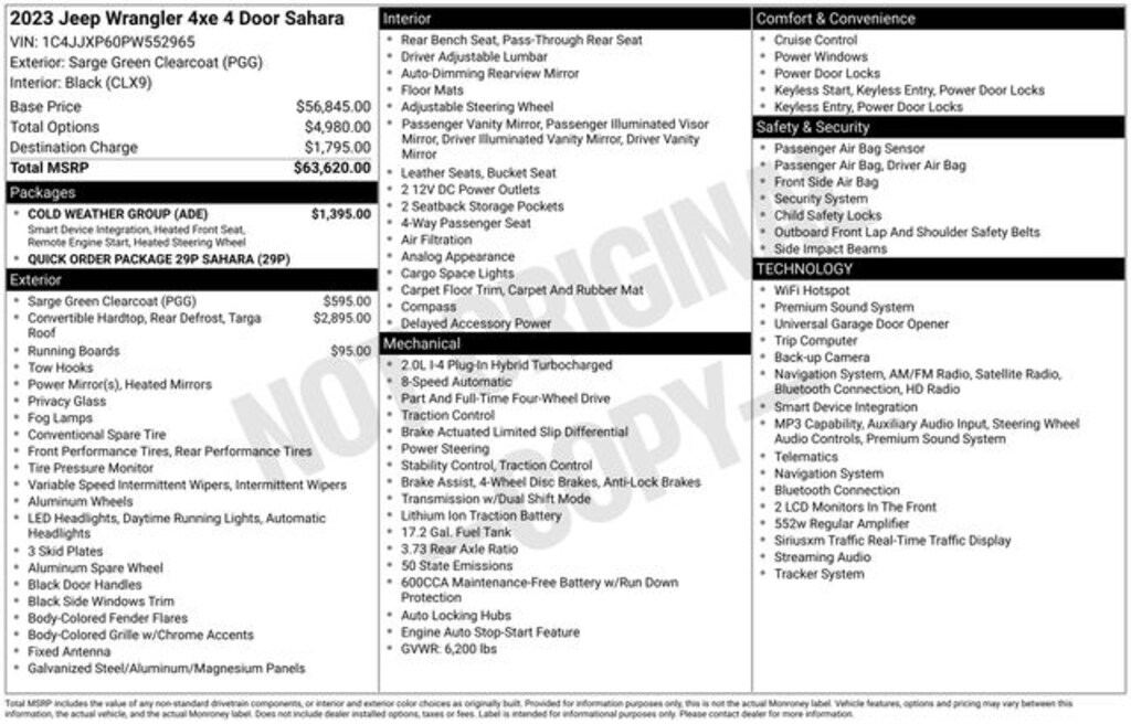 Beneath the surface, this Wrangler Sahara 4xe is engineered to conquer the great outdoors. The 2.0L I4 DOHC engine, paired with the 8-speed automatic transmission and 4WD system, delivers the power and capability you expect from a Jeep, while the 4xe hybrid technology enhances efficiency and reduces emissions.